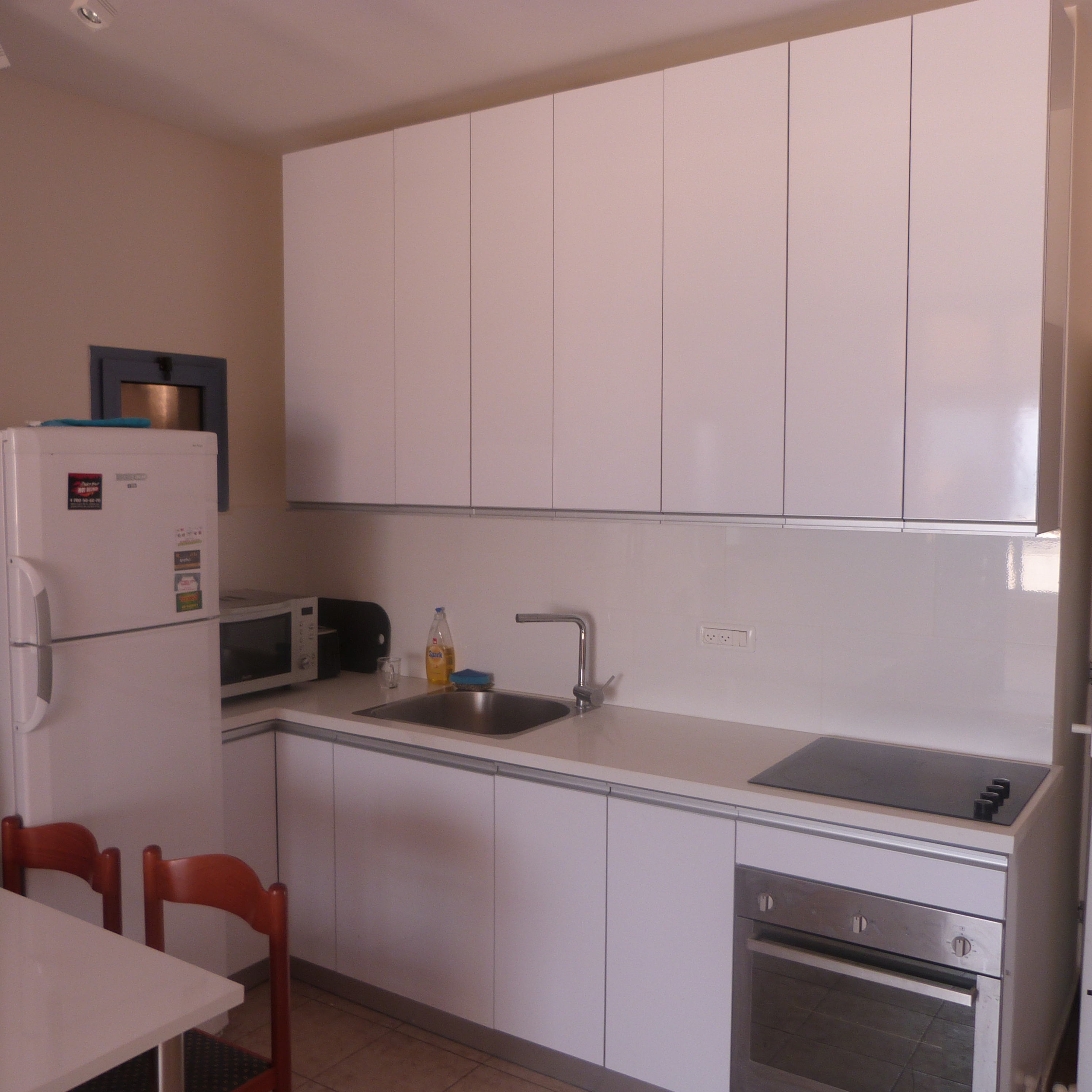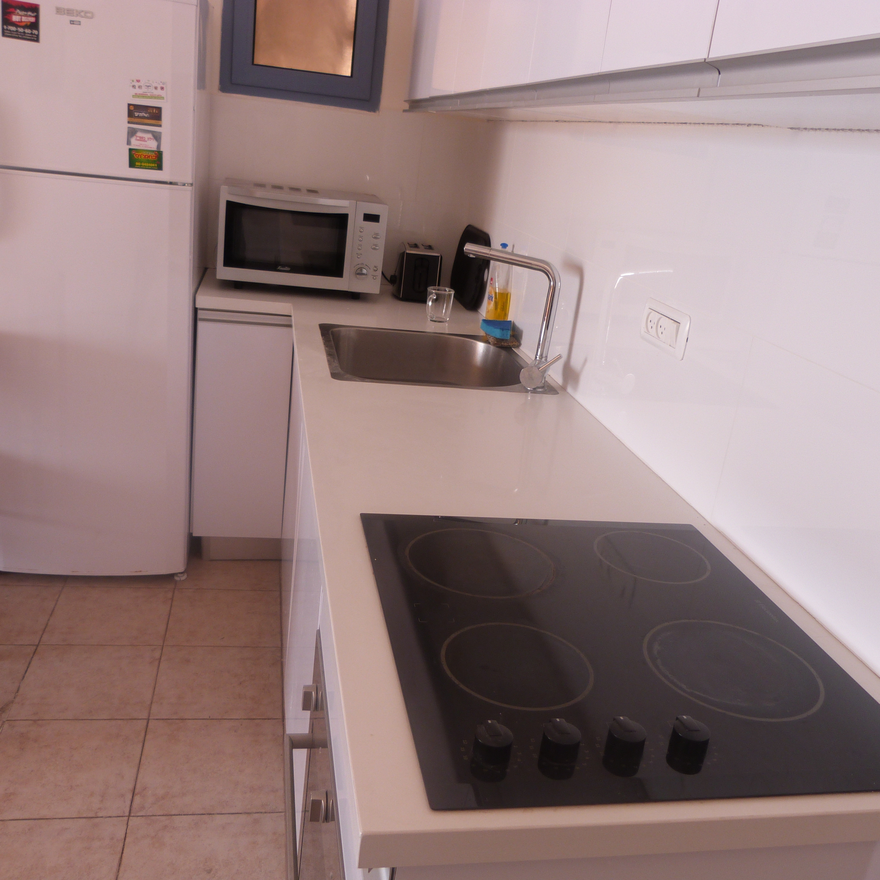 Квартира – гостиная с красивой кухней, две спальные комнаты, большой балкон с маркизой и красивым видом на море.